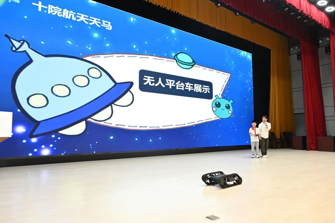 “同學們,你們知道火箭是怎么飛上天的嗎?”在活動現場,十院十部青年講師石龐從一個問答開始,為小朋友們帶來了一場趣味橫生的航天科普課堂。“中國外骨骼可以幫我抬腿!”“看!那個無人車可以上樓梯!”十院航天天馬無人平臺車和十院航天控制外骨骼展示,瞬間點燃了現場氛圍。