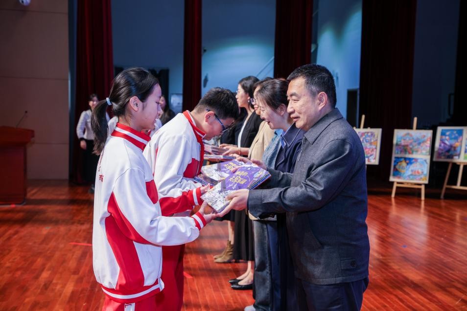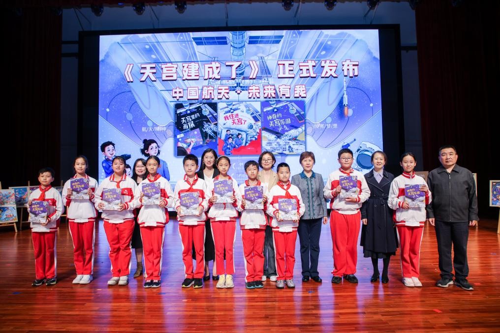 隨后,吳杰、沈立鳳與中國航天科工二院208所二級專務李曉紅共同觸摸啟動球,主視覺大屏同步呈現繪本封面與“天宮建成了”主題字,標志著這套入選“十四五”國家重點出版物出版規劃項目的科普繪本正式發布。緊接著的贈書儀式上,與會嘉賓將繪本贈予學生,為育英校園播撒下航天夢想的種子。