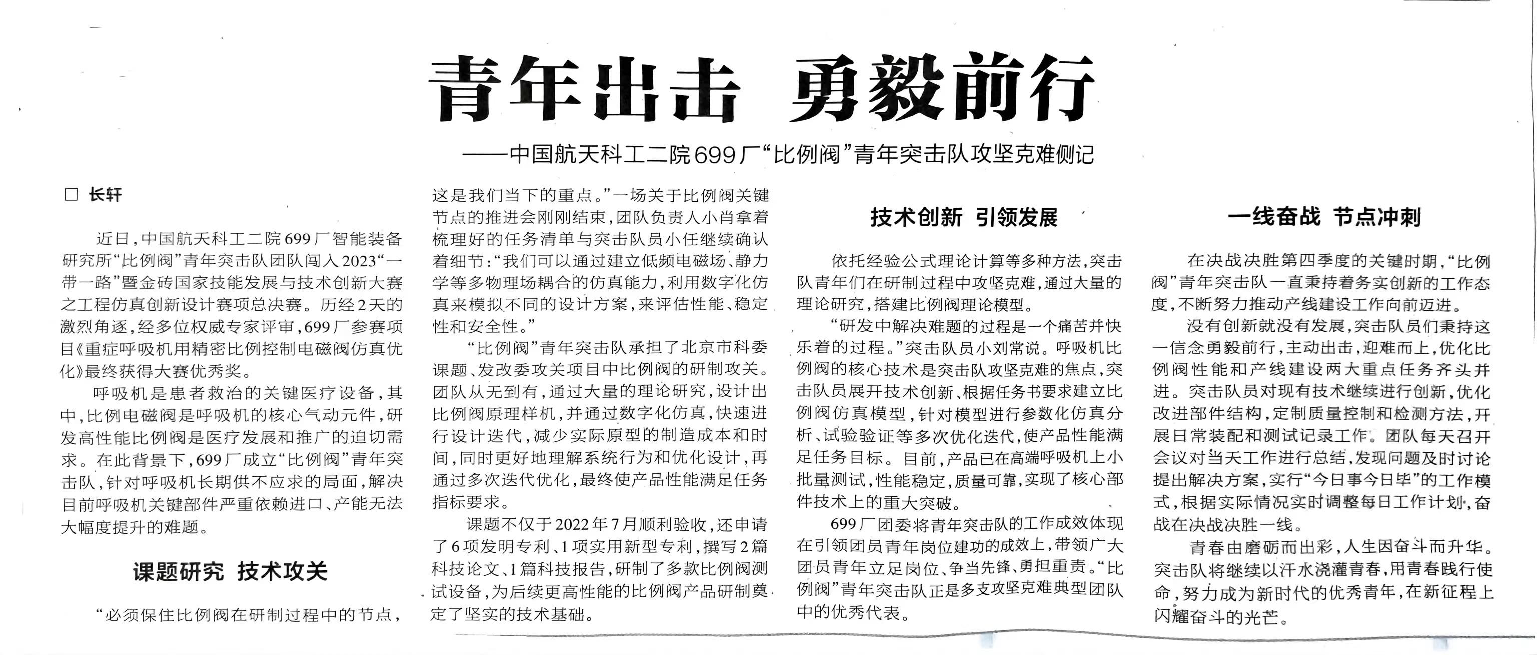 在全年科研生產工作中,青年突擊隊成績斐然。在全院一盤棋精神感召下,迅雷青年突擊隊大力協同,勠力力同心、努力拼搏,加班加點,僅用4天完成兄弟單位某設備生產調試任務,為兄弟單位在空間特殊環境中試驗提供了有力保障;二齊青年突擊隊在承接任務過程中積極創新,自制工裝,研究新方法,新技術,使得技術方法有了新的突破,拓寬了699廠承接任務廣度;加油桿青年突擊隊為了全力保障總體在試驗場調試進度,將調試任務模塊化分配,并責任到人、節點到天,成功配合總體完成聯調;“極限沖鋒”青年突擊隊杜絕“差不多”,追求“零缺陷”,認真梳理產品狀態,做好工藝審查,提早發現問題,留出解決問題的時間,提前消除質量隱患,為一流質量保駕護航;“創新創效”青年突擊隊在保障生產任務同時,年度突破性承接15項課題研究工作,編制和修訂標準7項,特殊過程確認9項;翱翔青年突擊隊致力于科研創新,依托型號任務積極開展工藝攻關與工藝細化量化工作,通過創新手段實現精細化管理,獲得2023年中國創新方法大賽北京賽區二等獎;“比例閥”青年突擊隊獲2023一帶一路暨金磚國家技能發展與技術創新大賽優秀獎。青年突擊隊始終用青年合力為企業科研生產任務的高質量完成作出了堅強的保障。
